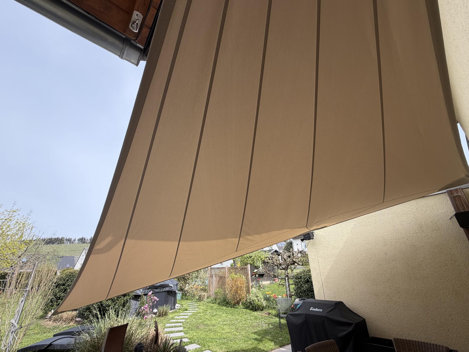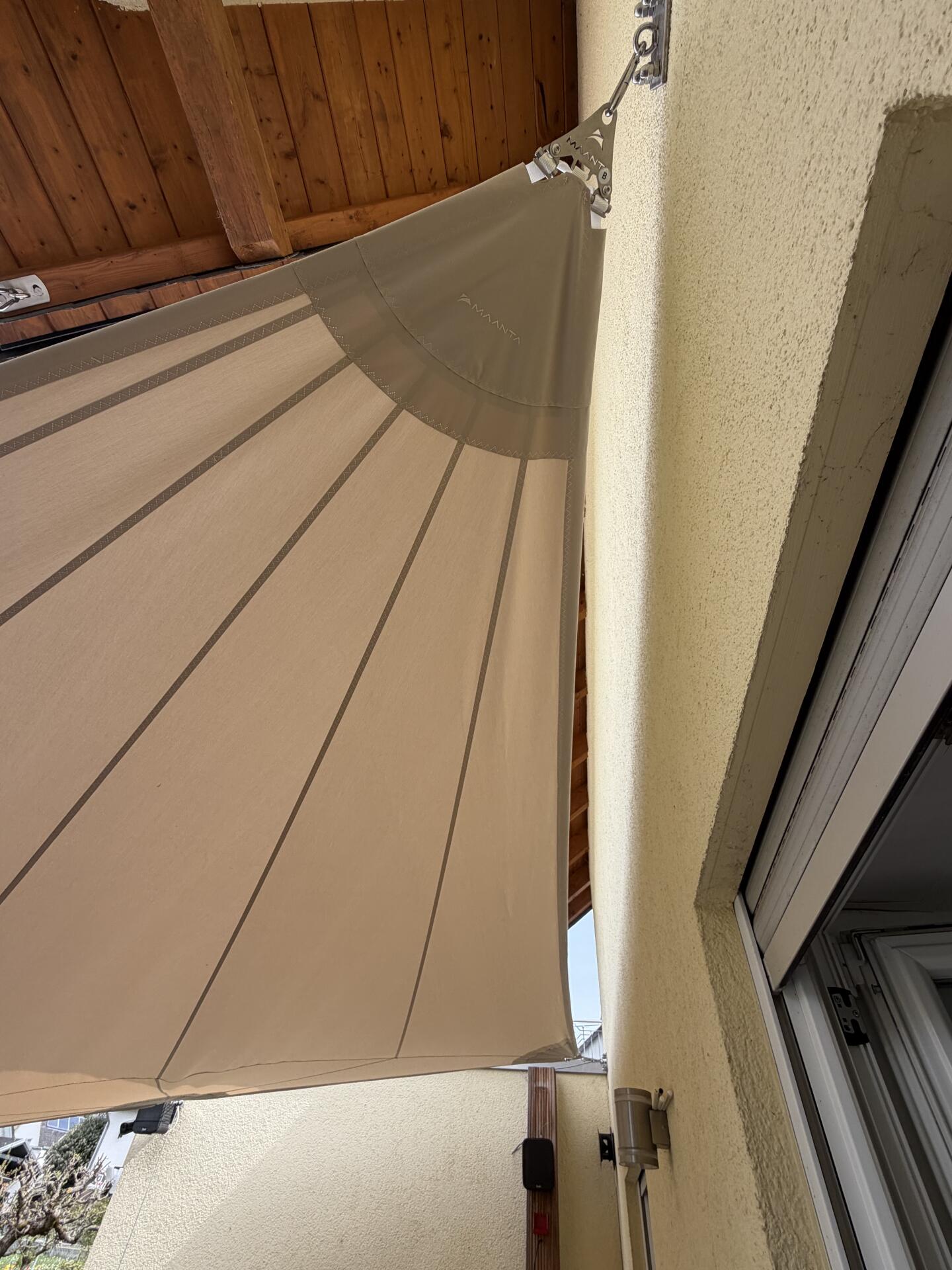 • Lean: our solution with one side mounted against the wall, perfectly sealed using an aluminum profile. This configuration is ideal for preventing water from dripping between the wall and the sail when it rains.