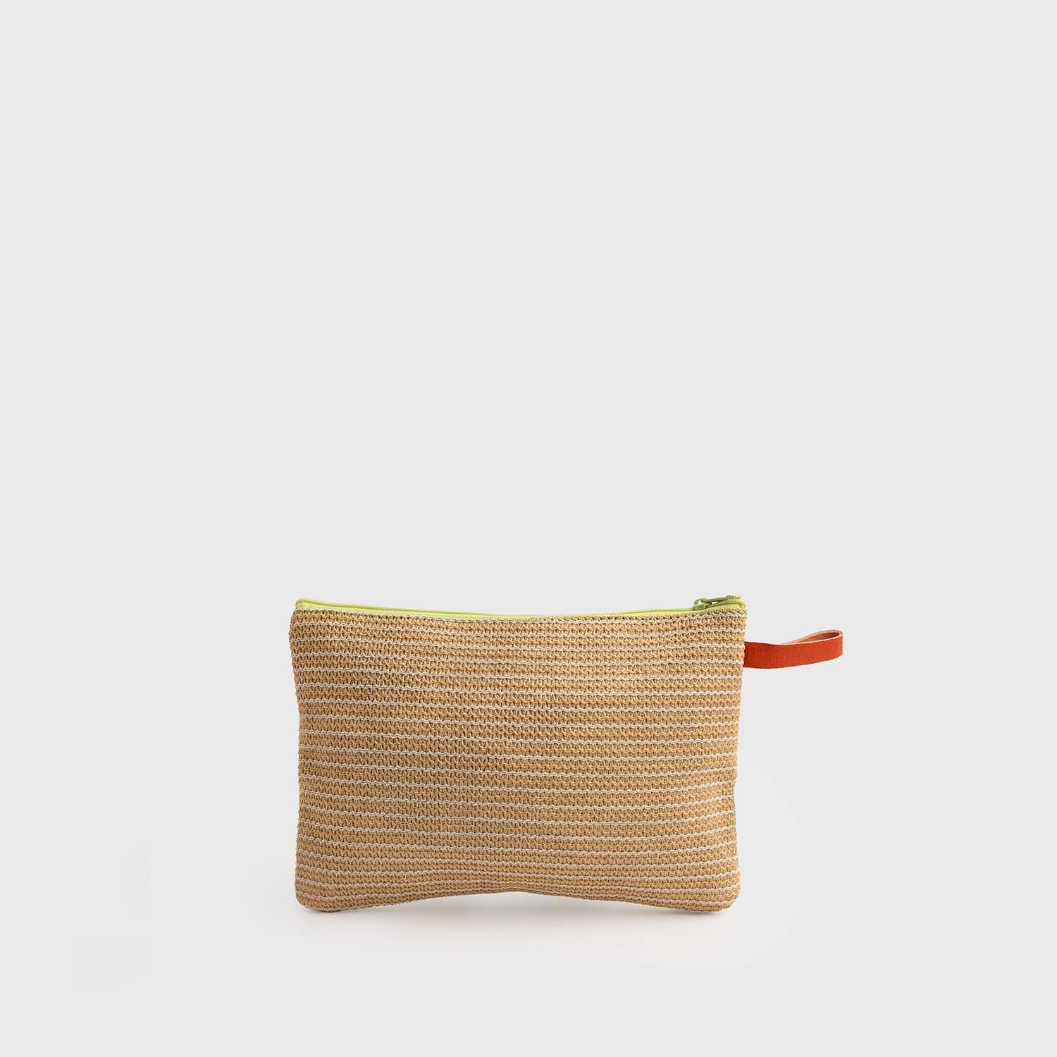 Clutch bag made with the creative recycling formula, two-tone with green, blue and orange details with top zip closure.