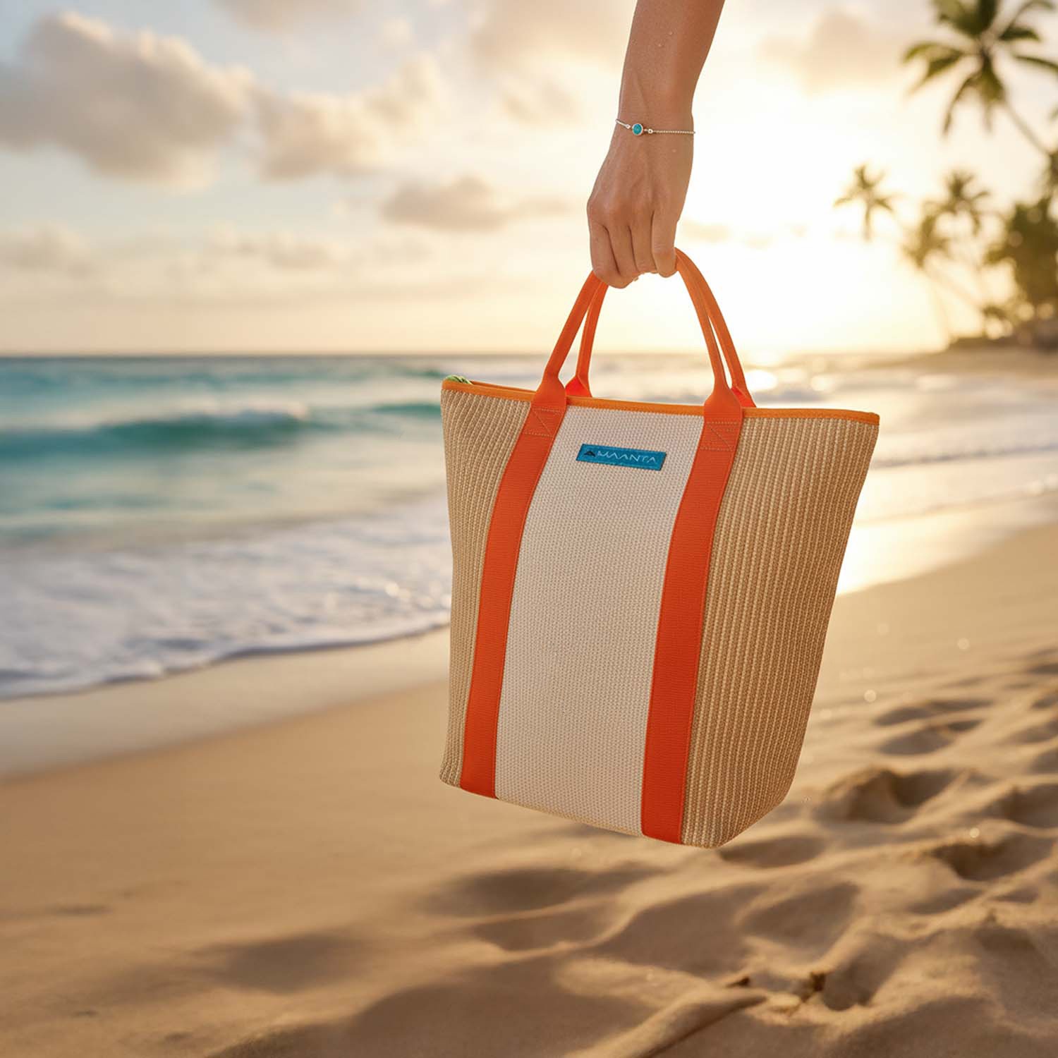 Two-tone beach bag with orange inserts and green and blue details, comfortable fabric handles, top zip closure.