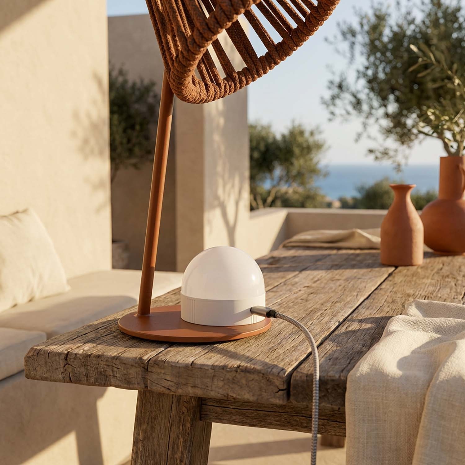Mini Ropelle is designed for mixed indoor/outdoor use. It's perfect for covered terraces, pergolas, and garden tables, as well as living rooms, desks, and bedside tables. Thanks to its IP44 rating, it is splash-proof, but it is not suitable for direct exposure to heavy rain or submersion in water.