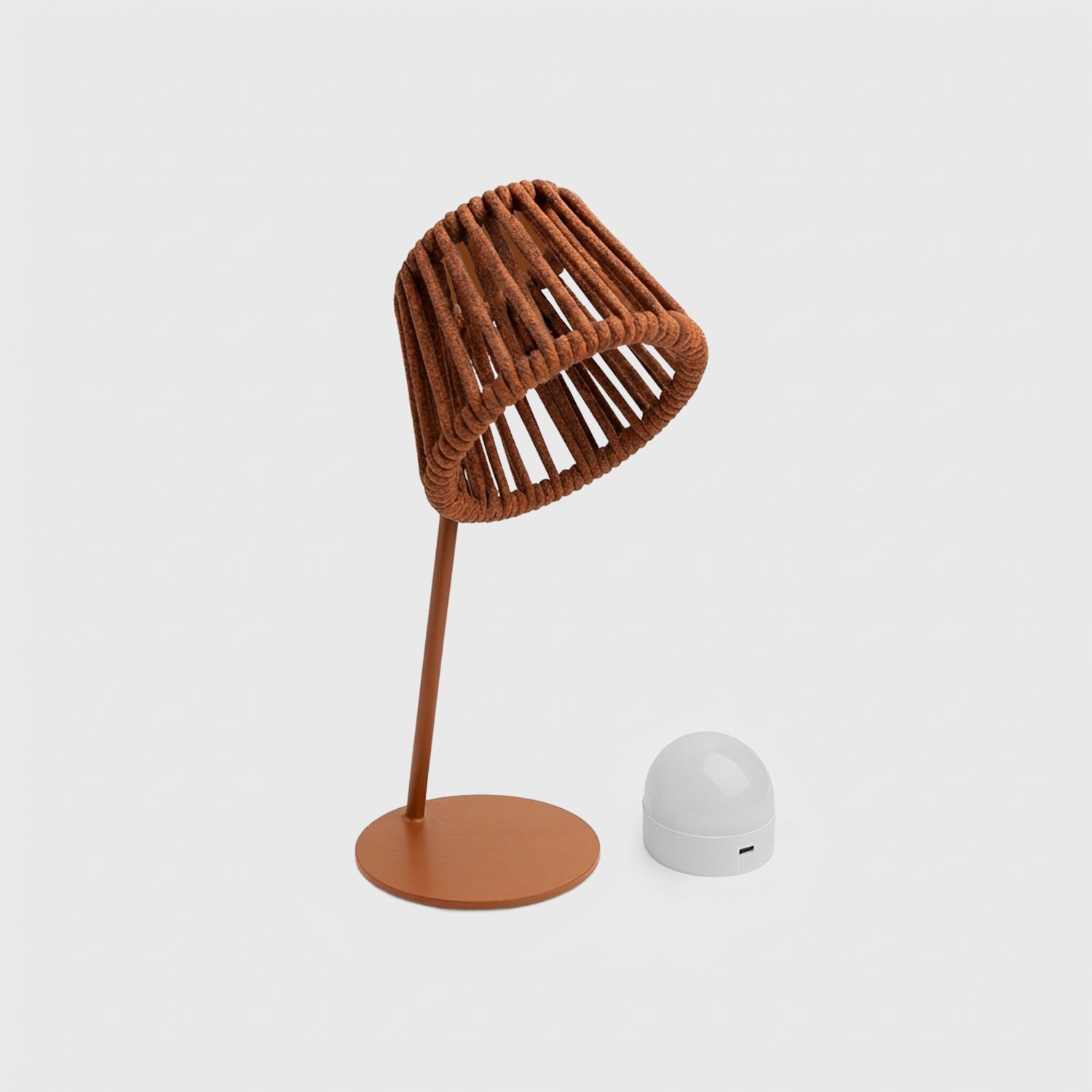 Mini Ropelle is a rechargeable wireless table lamp, designed by the Maanta style studio. It belongs to the Rope family: the same outdoor olefin rope, the same design language as the floor-standing Ropelle, in a compact 13×31.5 cm format. Its defining feature is the Mag bulb, which detaches from the lamp to be charged separately via USB-C.