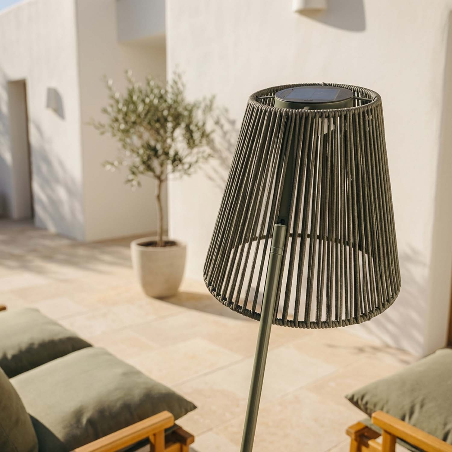 Ropelle is a 160 cm tall floor lamp with a solar panel and dusk sensor. Mini Ropelle is a compact table lamp (50 cm) with USB-C charging, ideal for tables, bedside units and windowsills. Both are IP65 rated and share the same design, featuring an olefin polypropylene rope finish.