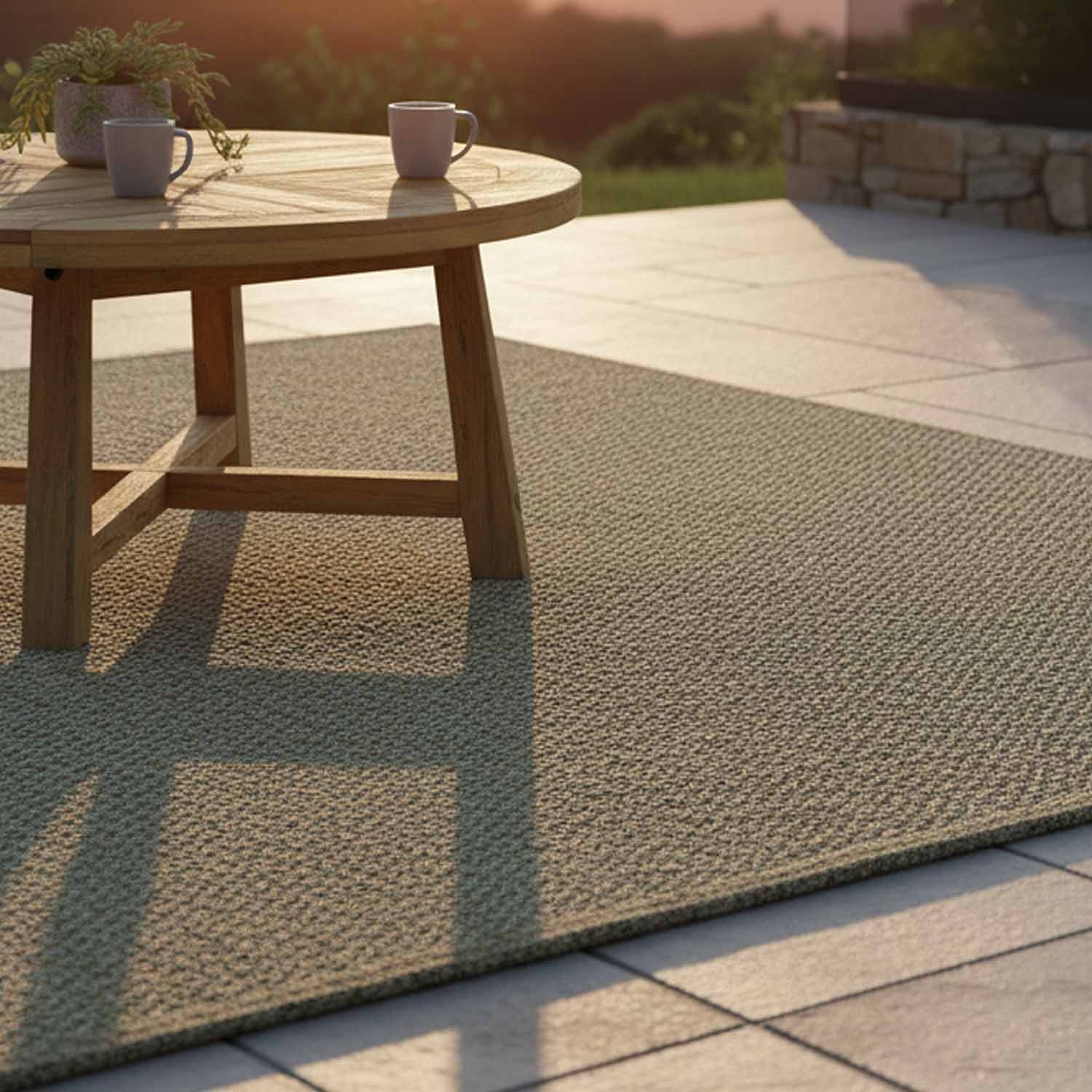 It means that each Tramelia garden rug is crafted by hand by skilled artisans who weave the fibres on traditional looms. No two pieces are exactly alike: slight variations in the weaving tension create unique textures. It is a slower process than industrial production, but it ensures premium quality and distinctive character.