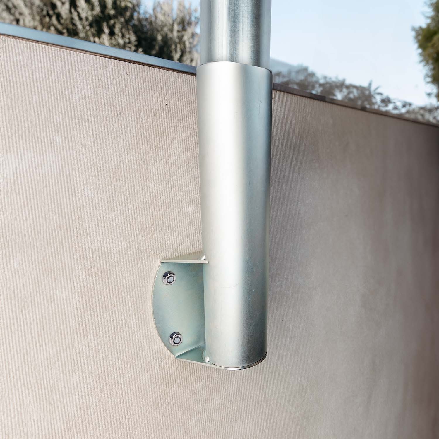 The steel collar allows the pole to be attached directly to a wall or 35/40 cm high masonry fence, which is also ideal for terraces or non-drillable surfaces.