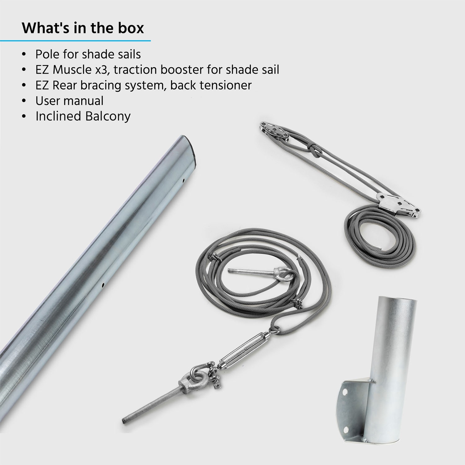Get everything you need with our full kit of accessories, in the wall collar version you will find two steel plates, in the balcony version you will find the inclined plate, all include kits for tensioning the sail and any rear bracing system, hardware and screws.
