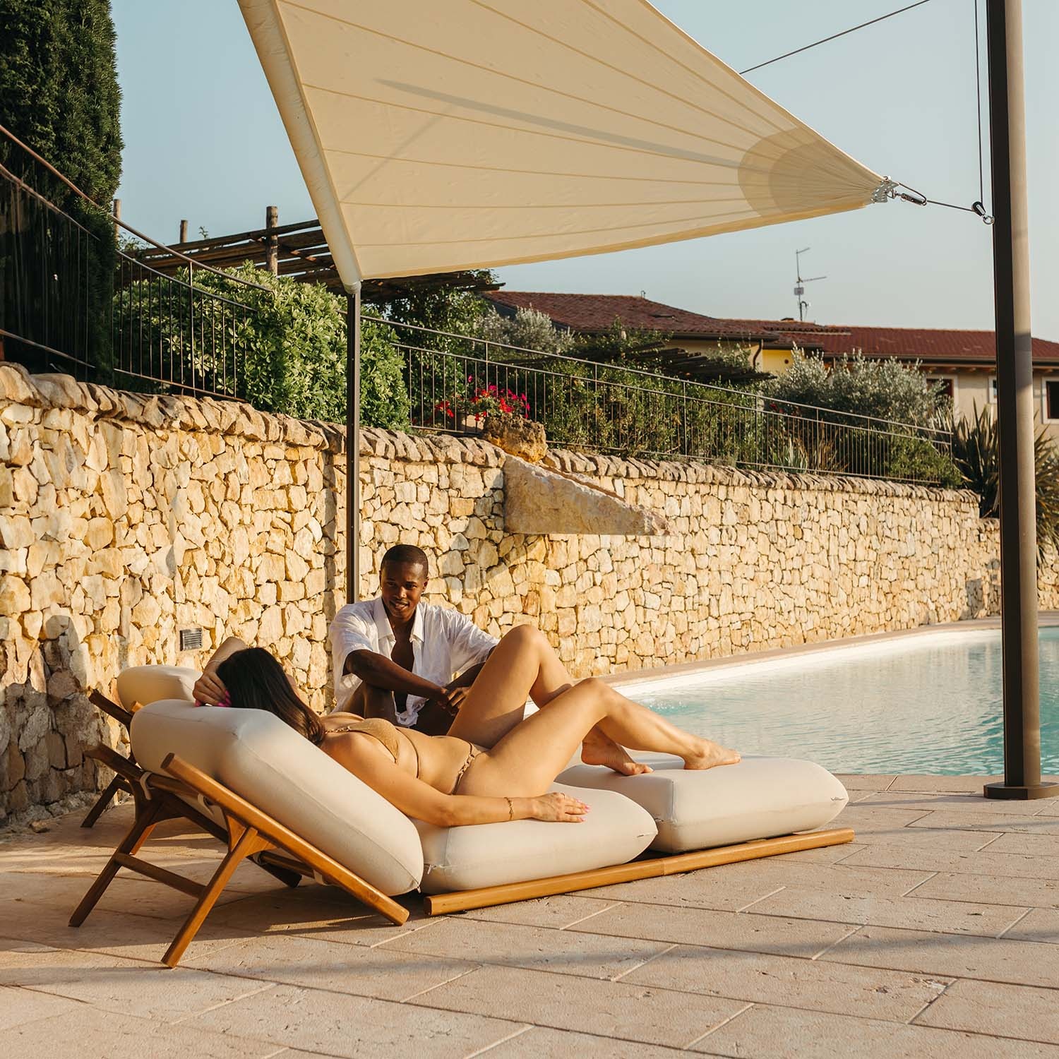 Maanta, an Italian brand specialising in outdoor shading, designed Zefira for maximum autonomy through solar power. Mains power is only used as an emergency backup when the battery is completely discharged.Designed by Maanta, an Italian brand specialising in outdoor shading, Zefira doesn’t rely on mains electricity. A plug is only used as backup when the battery is completely drained.