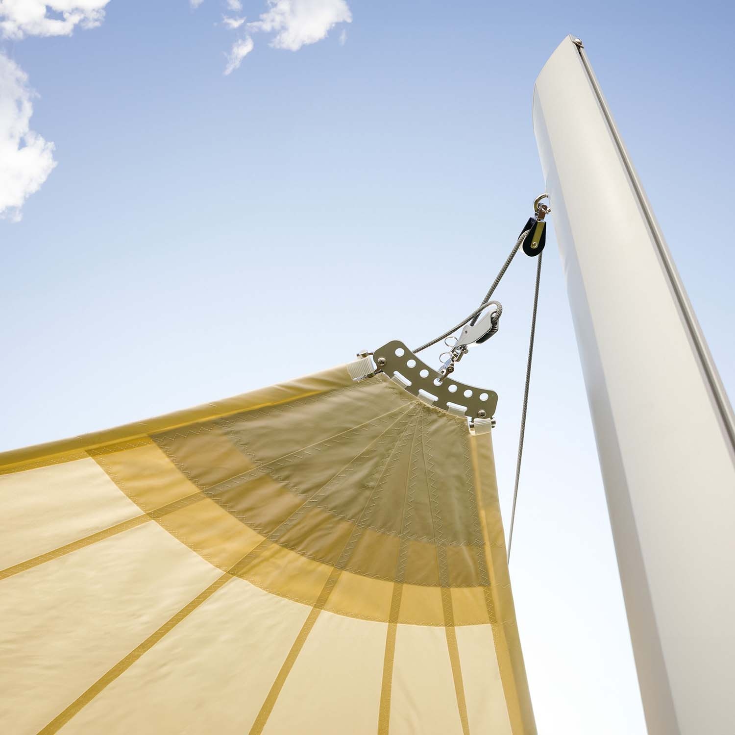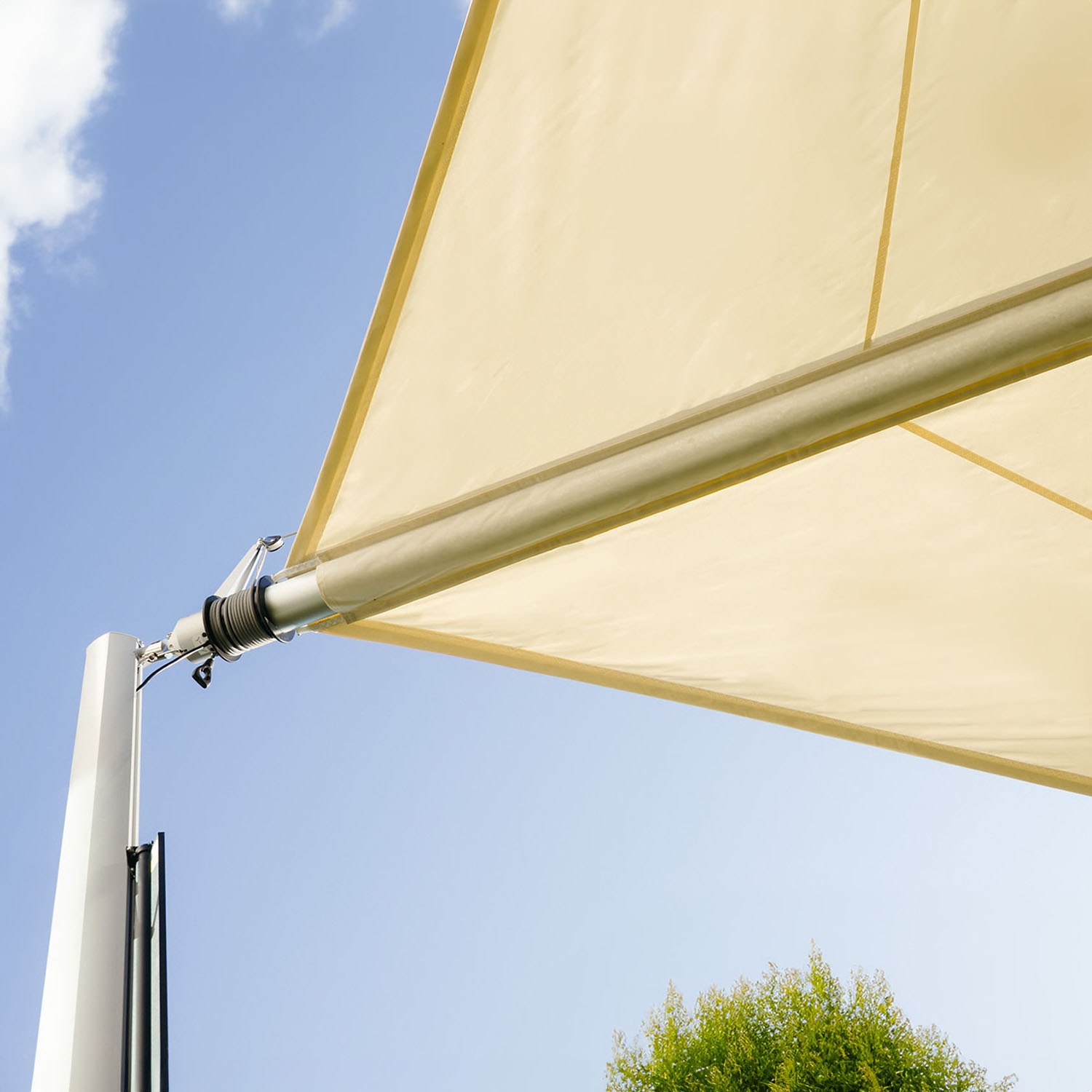Included components – Tensioning system Spring unit, rope winding pulley, corner pulleys on the sail, tensioning rope, cantilever bracket