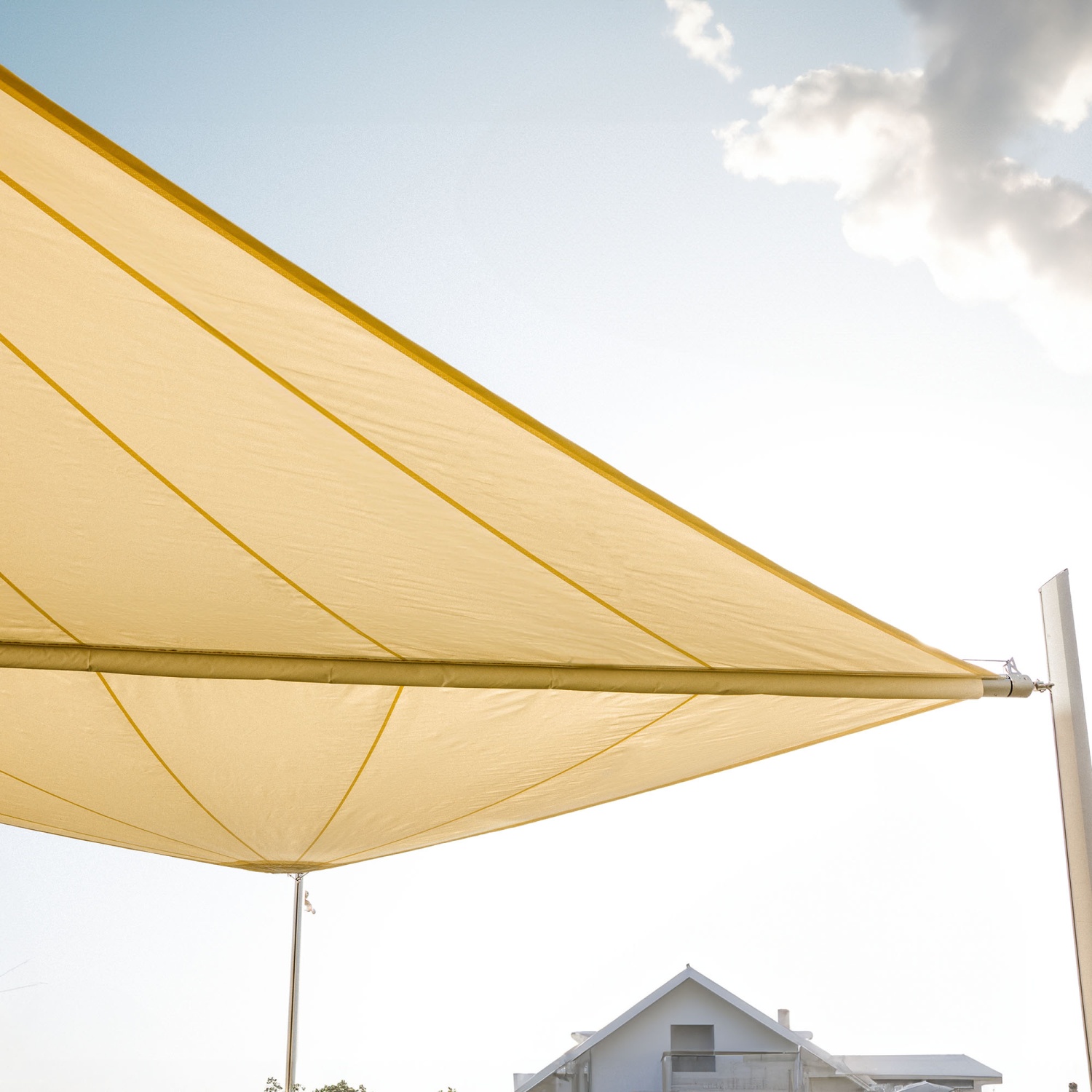 Zefira standard is available in six fixed sizes (4×4 m, 5×5 m, 4×5 m, 5×6 m, 5×5×5 m, 6×6×6 m) with fast delivery. Custom Zefira is tailored to fit your space, with personalised production time. The technology and materials are identical in both versions of the motorised retractable shade sail by Maanta.