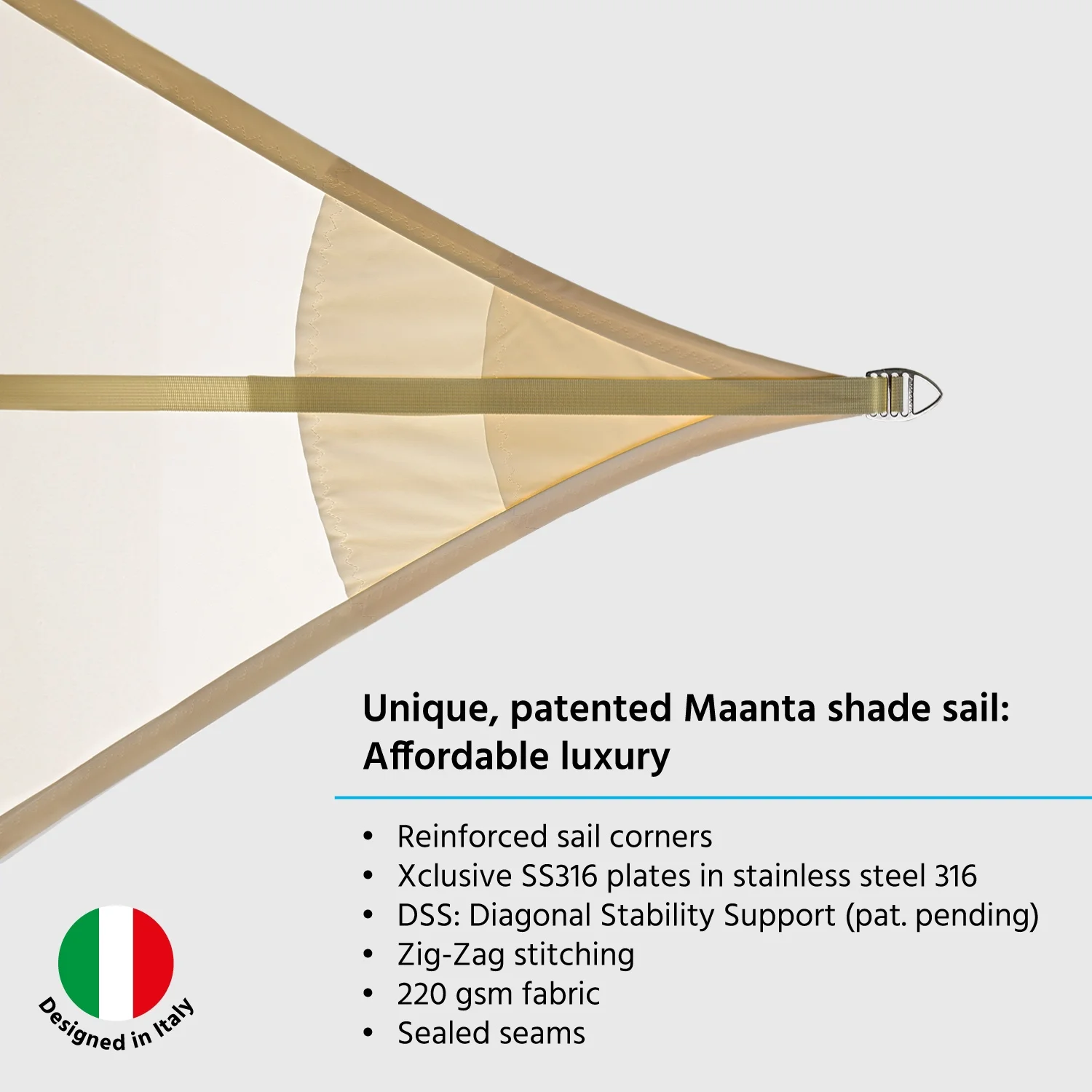EZ Breez is Maanta's entry level sail, despite being among the cheapest, it has a patent (pat. pending) that allows water to drain away thereby improving stagnation in pockets that might form in heavy rain.