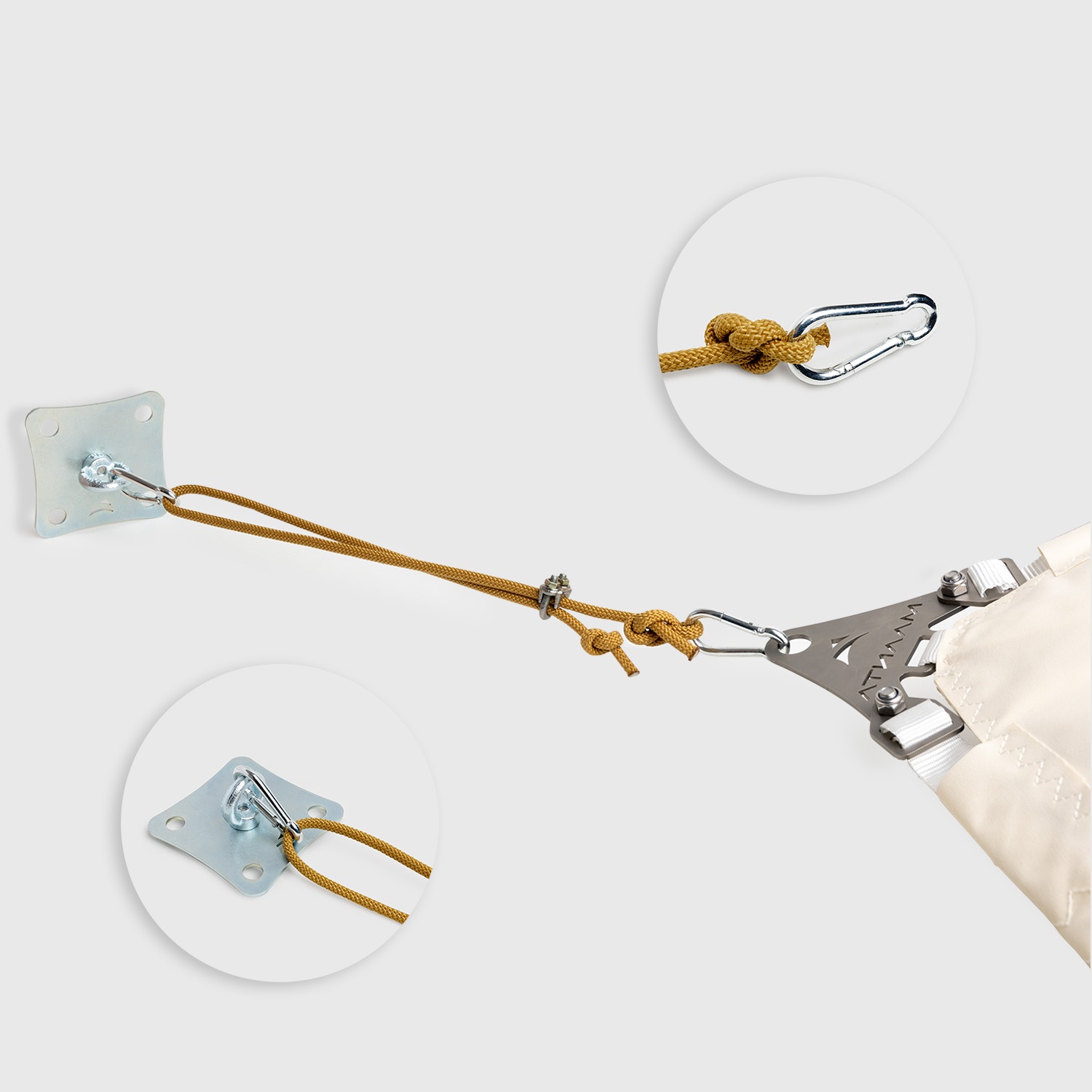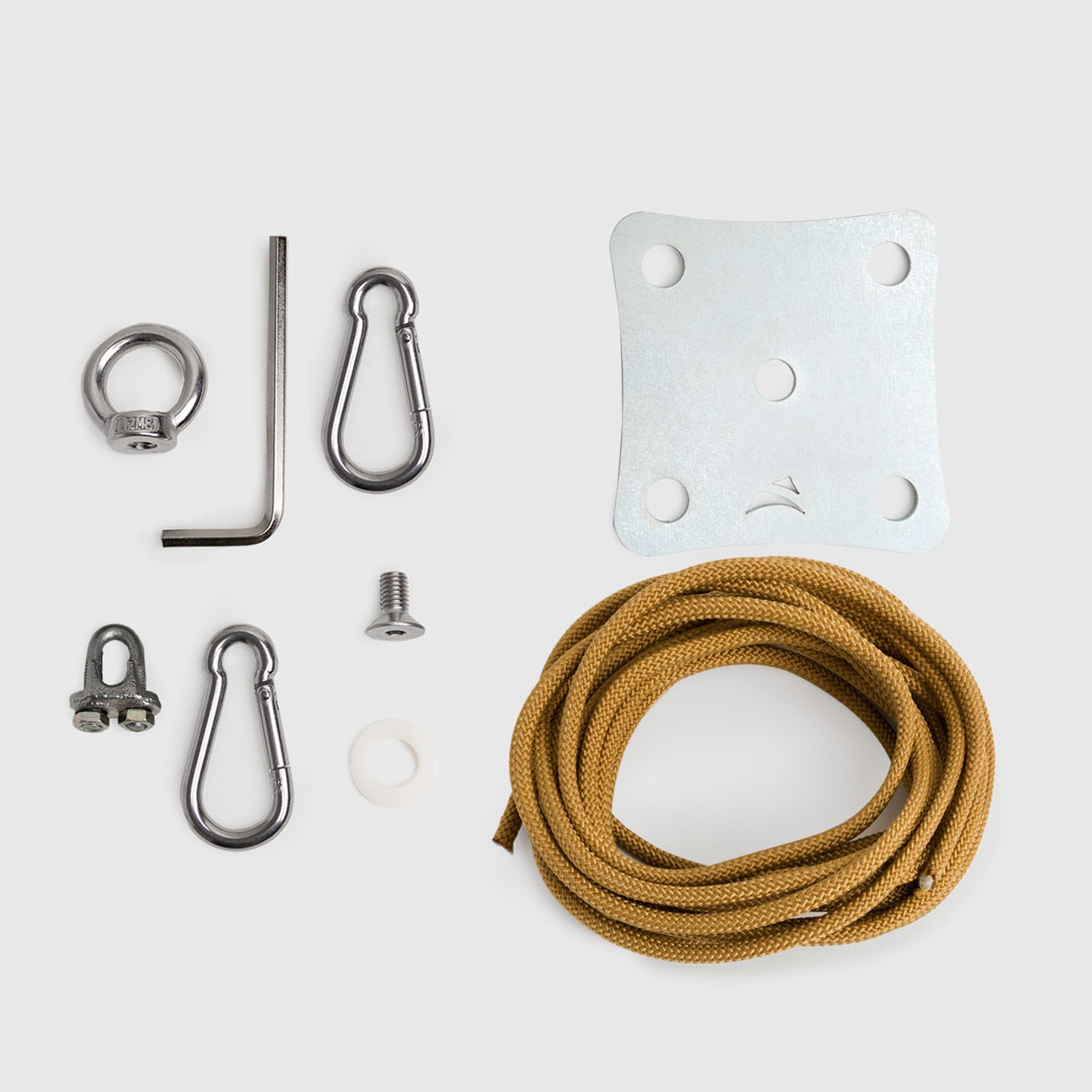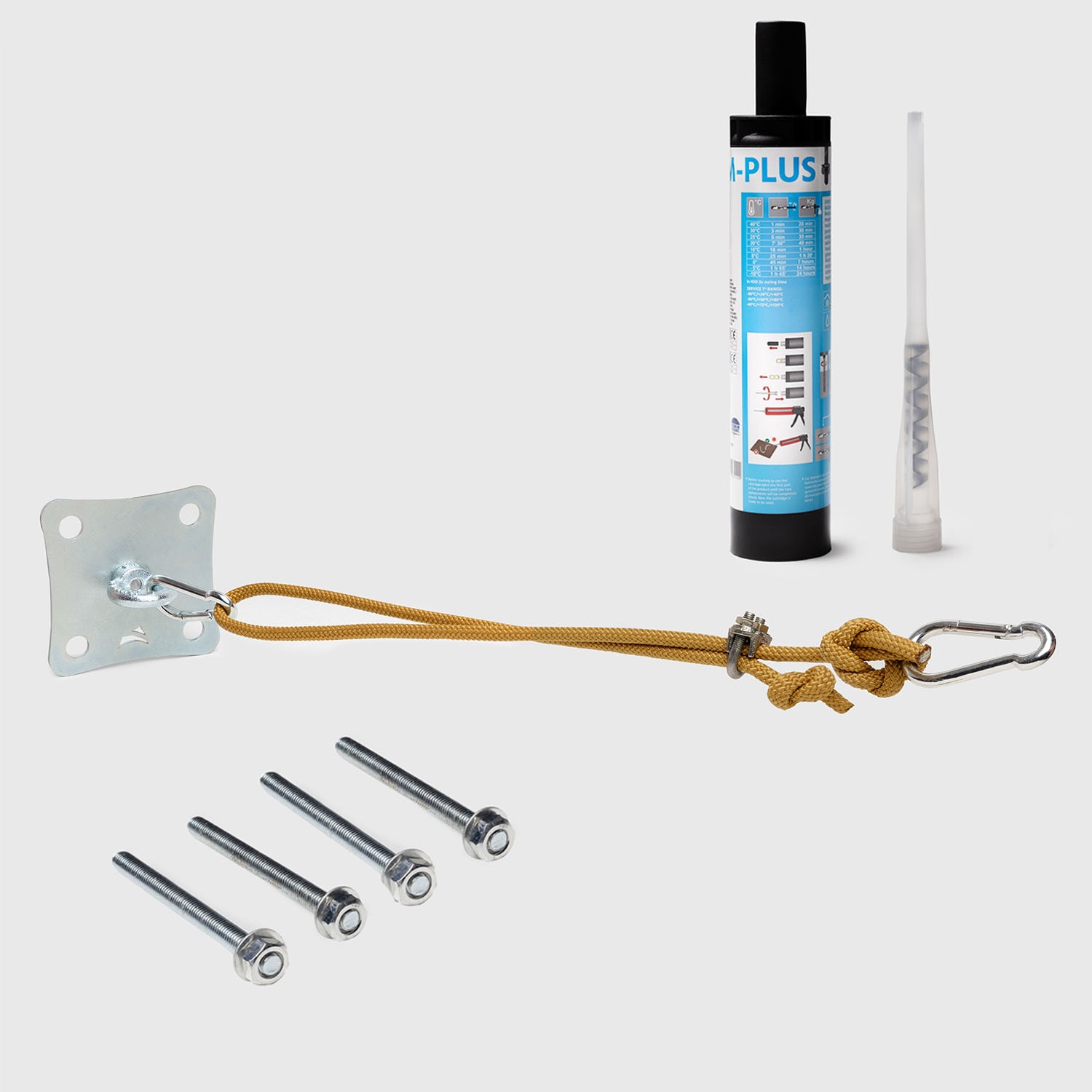 • Complete kit: robust 10x10 cm square plate in galvanised or stainless steel, 2 carabiners in galvanised or stainless steel, U-bolt (for length adjustment), 2 metres of nautical rope (choose kits that include threaded rods and chemical anchor)