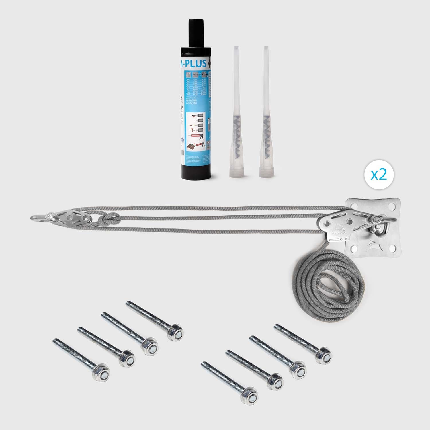 • Complete kit: sturdy square steel plate, 2 D-shackles, 2 pulleys (1 regular and 1 with cam cleat), 4 metres of nautical rope (Choose the kits with threaded rods and injection mortar included)